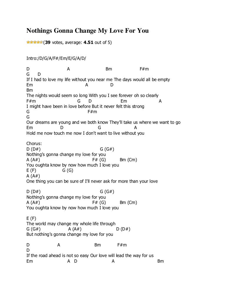Nothings Gonna Change My Love For You Chords Intro C# F# G# F m Bm7/G# Eb/G Ebm Fm G# Verse 1 C# G#/C m If I had to live my life without you near me m7/G# F#Fm The days would all be empty Ebm G# The nights would seem so long C# G#/C m With you I see forever oh, so clearly m7/G# F# Fm I might have been in love before Ebm G# But it never felt this strong F# C#/F Our dreams are young and we both know C#7 F# They'll take us where we want to go Ebm Fm Hold meBecome A Better Singer In Only 30 Days, With Easy Video Lessons!Nothing Gonna Change My Love for You, Karachi, Pakistan 37,558 likes · 11 talking about this You Know What When I Talking To You I Wish I Could Stop